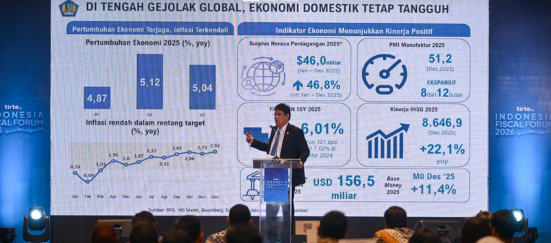 “Kalau kita 90 persen domestic demand, 10 persen global atau lebih. Mungkin maksimal 15–20 persen. Kalau kita juga ada domestic demand, harusnya tidak ada masalah,” ujar Purbaya dalam Acara Indonesia Fiscal Forum 2026 di Thamrine Nine Ballroom, Selasa, 27 Januari.